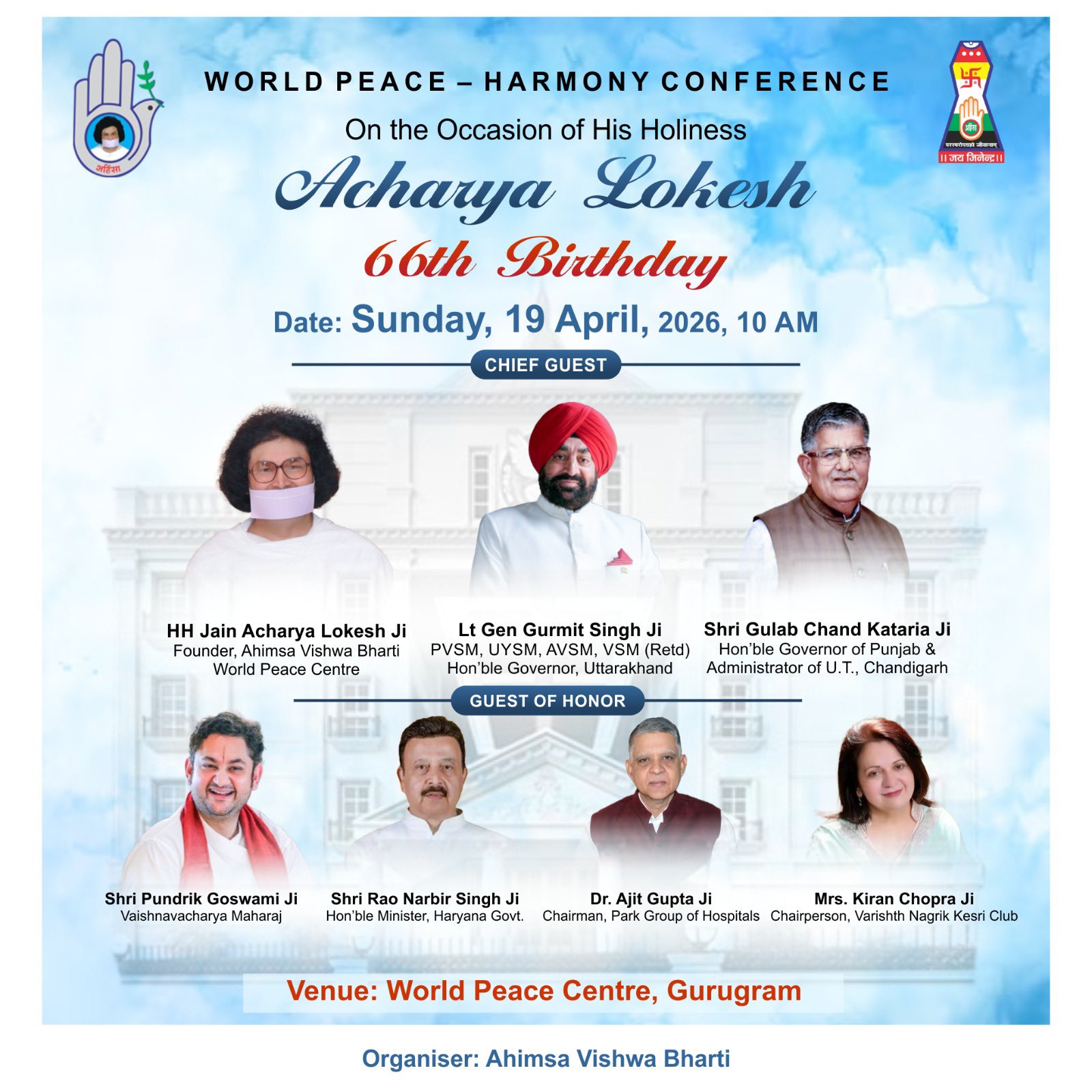 World Peace & Harmony Conference on the auspicious occasion of the 66th Birthday of HH Acharya Lokesh Ji on 19th April 2026 at World Peace Centre, Gurugram